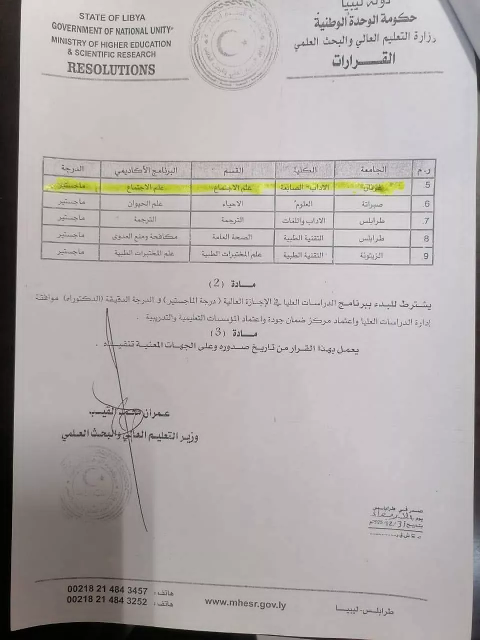 تزفّ جامعة غريان University of Gharyan ، وكلية الآداب الاصابعة - جامعة غريان، أسمى آيات التهاني وأصدق عبارات الاعتزاز إلى قسم علم الاجتماع، بمناسبة صدور قرار وزارة التعليم العالي والبحث العلمي - ليبيا بمنح الإذن ببرنامج الماجستير، في محطة علمية مشرقة تُضاف إلى سجل الإنجازات الأكاديمية.