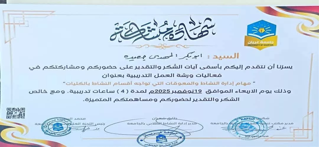 كل الشكر والتقدير ل جامعة غريان University of Gharyan على تنظيم هذه الفاعلية، ولجميع المشاركين الذين اسهموا في إنجاح هذه الورشة المميزة.